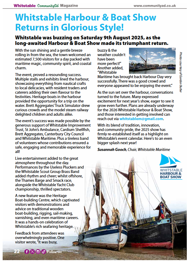 A massive thank you to everyone who made this year’s show an unforgettable celebration of our maritime heritage, community spirit, and coastal creativity! From the Heritage Boat Building Centre and the iconic 1906 Gamecock restoration, to the off-shore barge races, model steam-train and live music by the quay. Every moment was a tribute to Whitstable’s vibrant connection to the sea!